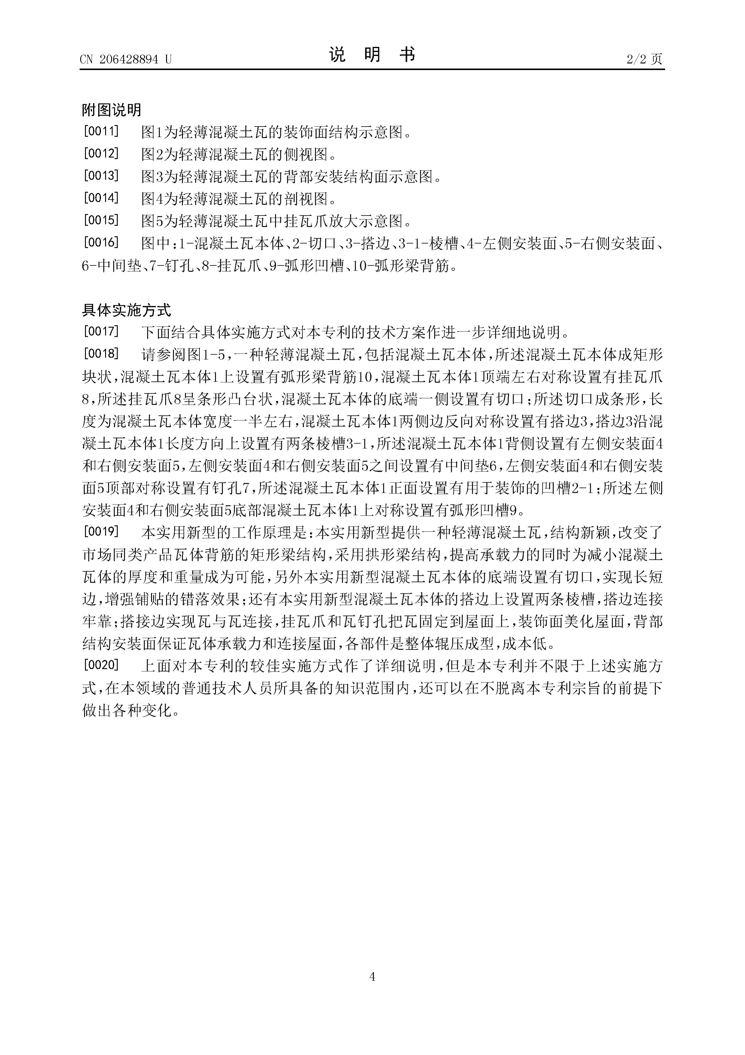 5.根據(jù)權(quán)利要求1所述的輕薄混凝土瓦,其特征在于,所述左側(cè)安裝面和右側(cè)安裝面底部混凝土瓦本體上對(duì)稱設(shè)置有弧形凹槽。